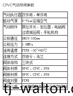 CPVC气动球阀,重量轻、耐腐蚀性强,被应用于多个领域,如一般纯水和生饮水的管路系统、排水和污水管路系统、盐水和海水管路系统、酸碱和化学溶液系统等多个行业,品质得到广大用户的认可。外型结构紧凑美观、本体重量轻容易安装、耐腐蚀性强,应用范围广、材质卫生无毒、耐磨损、容易拆卸,维护简单易行设计依据:ANSI JIS DIN GB 工作压力:0.6-1.0MPa 温度范围:32°F to 140°F(0℃ to 80℃)